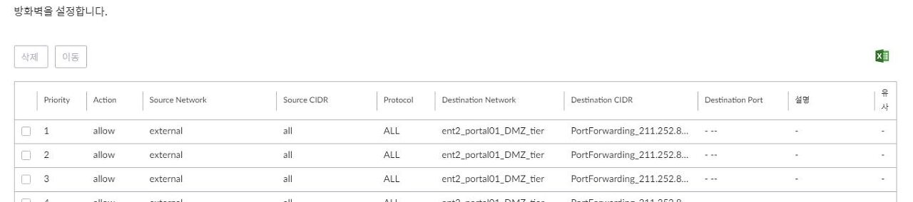 포탈 콘솔에서 방화벽 탭을 조회하면, 방화벽 정책들을 우선순위 순으로 조회 가능합니다.