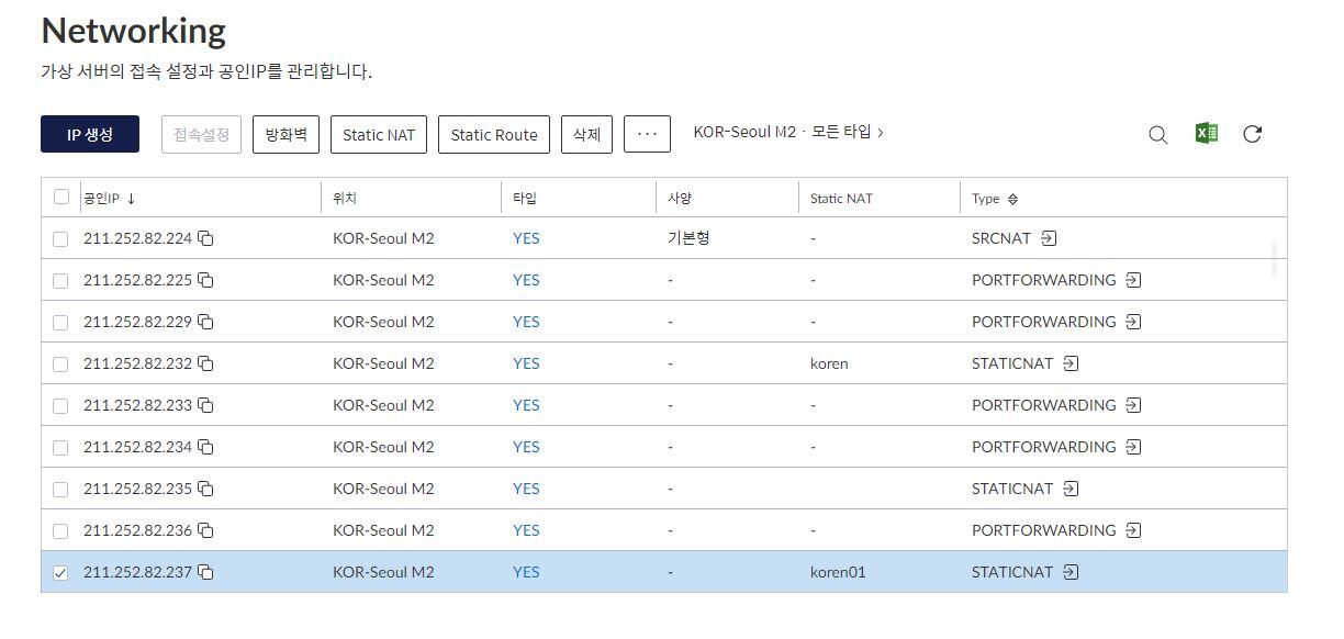 아래 KT Cloud server의 메뉴 중 네트워크 항목을 조회하면, 특정 IP의 TYPE이 SRCNAT로 설정되어 있는 것을 확인할 수 있습니다.