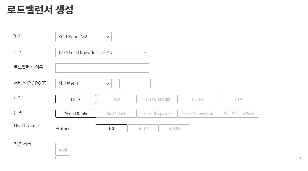 로드밸런서 구성에 필요한 IP(신규/기존)/포트, 로드밸런서 타입(프로토콜), 로드밸런서 옵션(메소드), Health Check, 그리고 적용 서버를 등록할 수 있습니다.