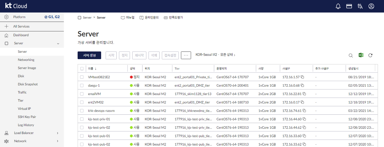 KT Cloud server – Tier 탭에서 Tier를 관리할 수 있습니다.