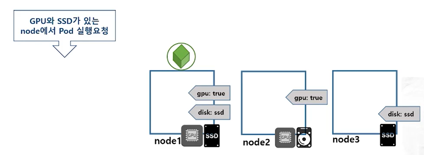 - worker node의 특성을 label로 설정하여 node를 선택해서 pod를 배치할 수 있음