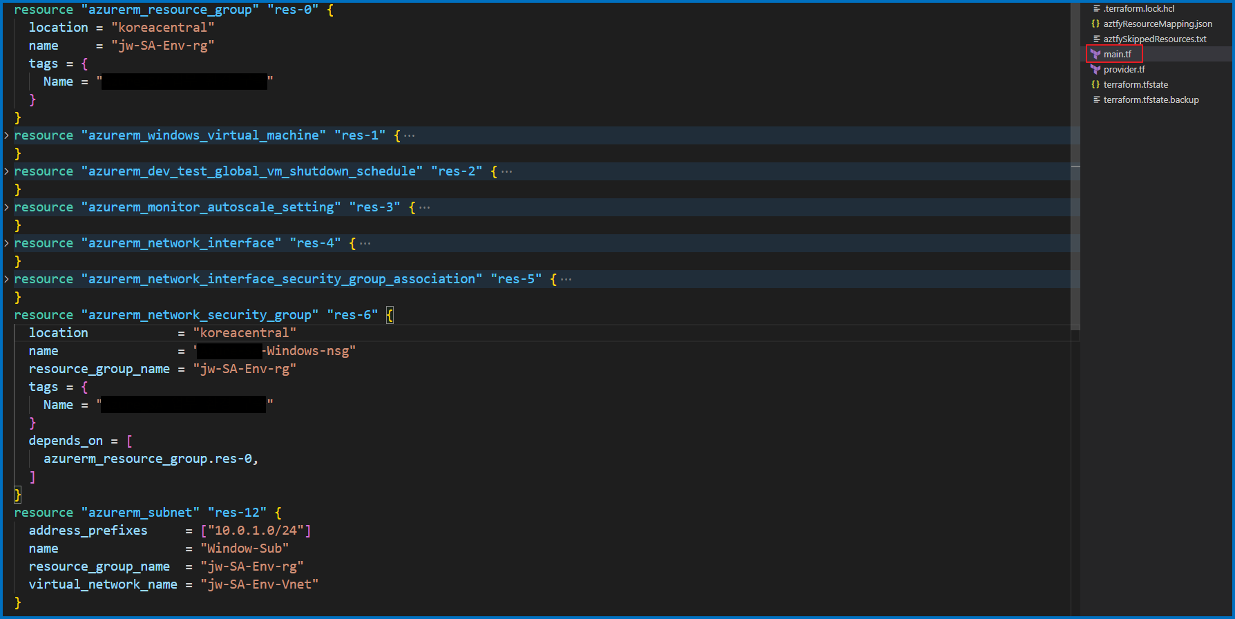 짜잔!! main.tf로 들어가니 Azure Portal에 배포되었던 리소스를 코드로 확인할 수 있습니다!