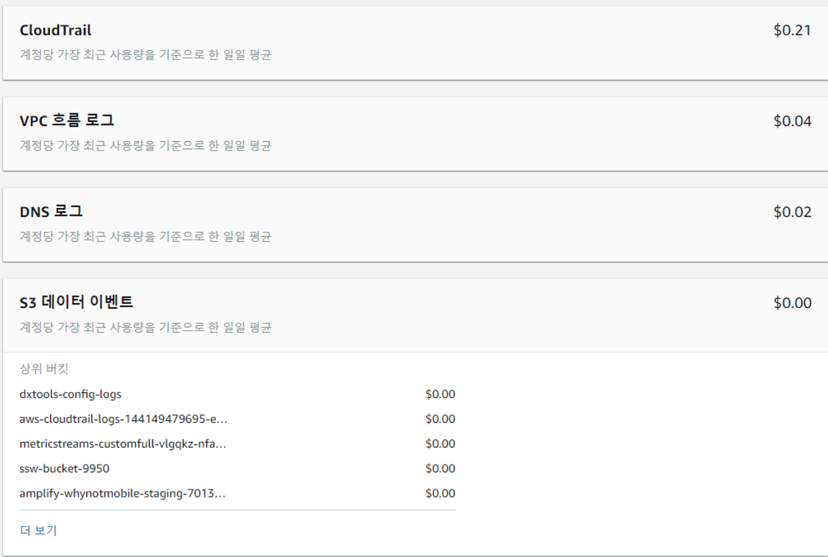 - S3 버킷 - 지정된 버킷의 S3 데이터 이벤트 예상 비용 또는 사용자 환경의 계정에 가장 비용이 많이 드는 버킷의 예상 비용을 나열