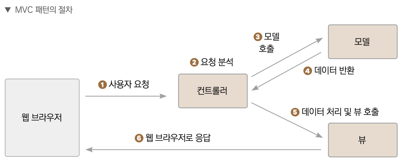 웹 애플리케이션은 사용자의 요청을 받아 처리한 후 응답하는 구조입니다. MVC는 모델Model, 뷰View, 컨트롤러Controller의 약자로, 소프트웨어를 개발하는 방법론의 일종입니다. 데이터 처리를 담당하는 모델과 화면 출력을 담당하는 뷰, 그리고 이 둘을 제어하는 컨트롤러가 각자의 역할을 분담하여 사용자의 요청을 처리한 후 결과를 웹 브라우저에 출력하게 됩니다.